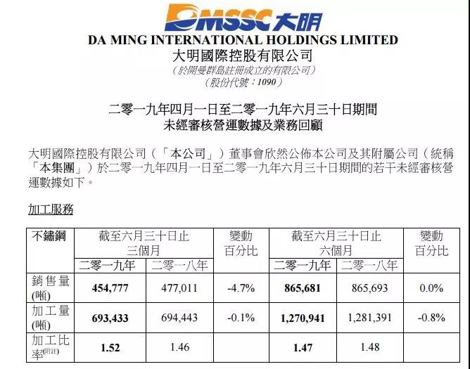 近日,大明國際發(fā)布公告,2019年二季度,集團(tuán)不銹鋼加工服務(wù)的總銷售量和加工量分別為45.47萬噸和69.34萬噸,同比下滑4.7%及0.1%。