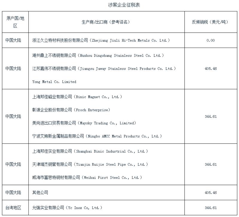 2019年7月25日,巴西經(jīng)濟(jì)部發(fā)布第506號(hào)法令,對(duì)原產(chǎn)于中國大陸和臺(tái)灣地區(qū)的奧氏體不銹鋼圓形焊管(葡語:tubos com costura, de a?osinoxidáveis austeníticos graus 304 e 316,de se??o circular)作出第一次反傾銷日落復(fù)審終裁:1. 繼續(xù)對(duì)中國大陸涉案產(chǎn)品征收為期5年的反傾銷稅;2. 終止對(duì)臺(tái)灣地區(qū)涉案產(chǎn)品的調(diào)查,不建議繼續(xù)延長對(duì)臺(tái)灣地區(qū)進(jìn)口產(chǎn)品征收反傾銷稅(除允強(qiáng)實(shí)業(yè)有限公司(Yc Inox Co, Ltd.)之外),具體稅額見下表(涉案企業(yè)征稅表)。涉案產(chǎn)品的南共市稅號(hào)為7306.40.00和7306.90.20。