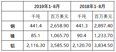 10月8日,官方海關(guān)數(shù)據(jù)顯示,俄羅斯2019年前八個月鋁和鎳出口量下滑,銅出口量增加。 以下為聯(lián)邦海關(guān)服務(wù)機(jī)構(gòu)提供的俄羅斯2019年1-8月鋁、鎳和銅出口數(shù)據(jù):