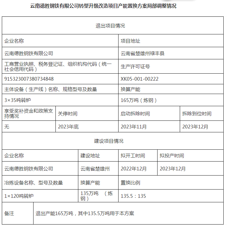 云南德勝鋼鐵有限公司轉(zhuǎn)型升級改造項目產(chǎn)能置換方案局部調(diào)整公示