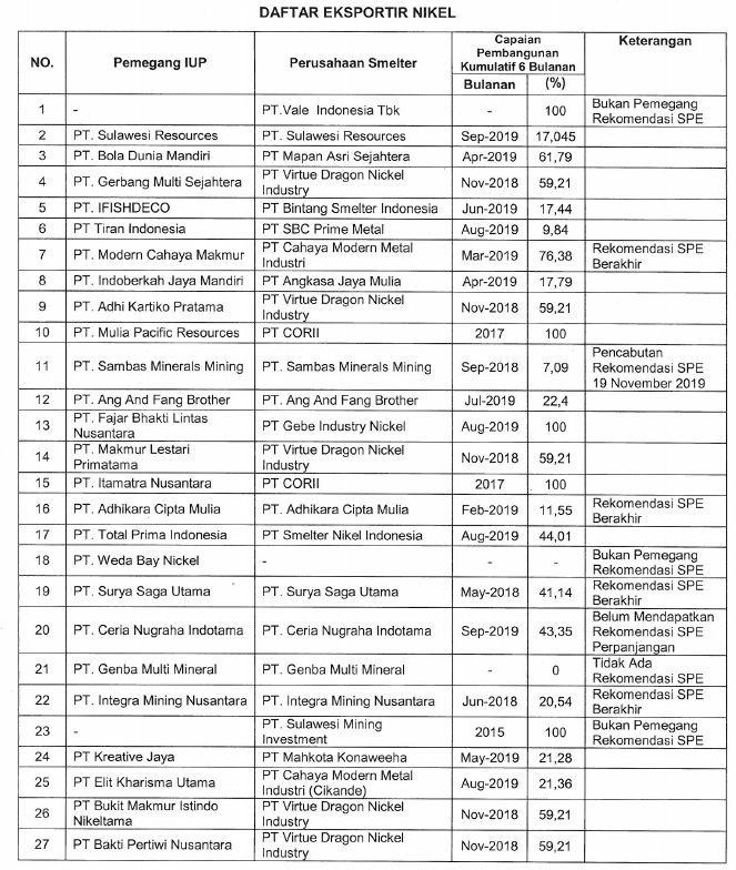 鎳礦企業(yè)在獲得鎳出口批準(鎳礦品位<1.7%)之前,公司必須首先獲得礦產和煤炭總干事的推薦,只有在公司已達到國家指定設施(冶煉廠)建設的實際進度時才能提出推薦(附圖如下)。