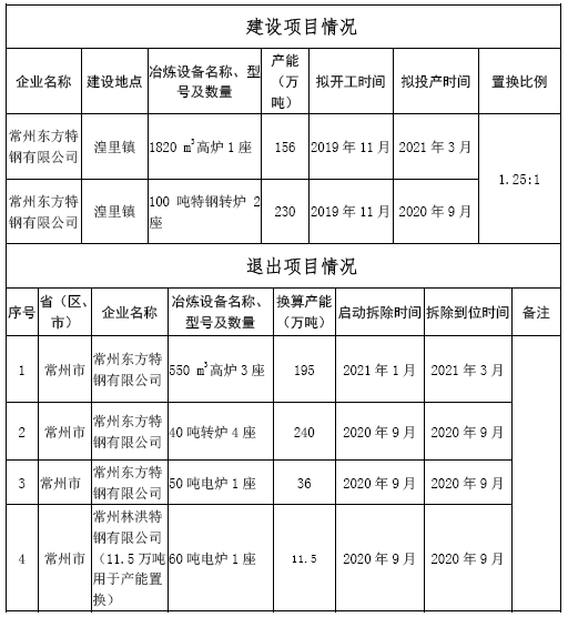 常州東方特鋼有限公司鋼鐵項目產能置換方案的公示