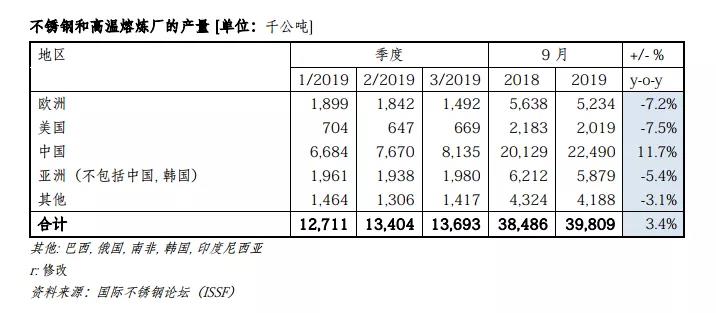 國際不銹鋼論壇(ISSF)12日發(fā)布的2019年前三季度數(shù)據(jù)表明,全球不銹鋼粗鋼產(chǎn)量與去年同比增長3.4%,達(dá)到3981萬公噸。