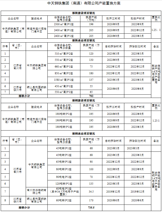 關(guān)于中天鋼鐵集團(tuán)(南通)有限公司產(chǎn)能置換方案的公告
