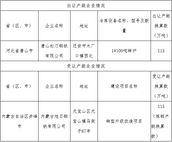 按照《國(guó)務(wù)院關(guān)于化解產(chǎn)能?chē)?yán)重過(guò)剩矛盾的指導(dǎo)意見(jiàn)》《國(guó)務(wù)院關(guān)于鋼鐵行業(yè)化解過(guò)剩產(chǎn)能實(shí)現(xiàn)脫困發(fā)展的意見(jiàn)》和《鋼鐵行業(yè)產(chǎn)能置換實(shí)施辦法》要求,現(xiàn)將唐山松汀鋼鐵有限公司產(chǎn)能出讓方案予以公告,歡迎社會(huì)公眾進(jìn)行監(jiān)督。