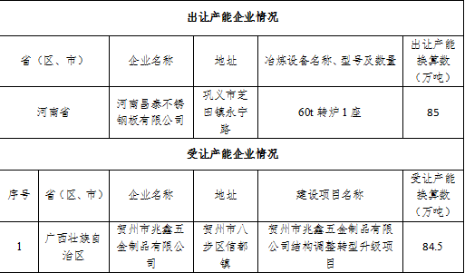 注:出讓產(chǎn)能換算數(shù)85萬噸,其中5000噸用于沁陽宏達(dá)鋼鐵有限公司項(xiàng)目產(chǎn)能減量置換,剩余84.5萬噸出讓至賀州市兆鑫五金制品有限公司結(jié)構(gòu)調(diào)整轉(zhuǎn)型升級(jí)項(xiàng)目,建設(shè)項(xiàng)目及裝備、減量置換情況以廣西壯族自治區(qū)工業(yè)和信息化廳產(chǎn)能置換公告為準(zhǔn)。