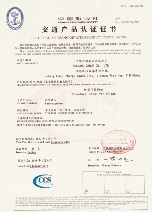 日前,沙鋼橋梁鋼板Q345qD/E、Q370qD/E、Q420qD/E、Q500qD/E憑借其強(qiáng)大的生產(chǎn)技術(shù)和過硬的產(chǎn)品質(zhì)量順利通過了中國船級社質(zhì)量認(rèn)證公司的產(chǎn)品認(rèn)證審核。