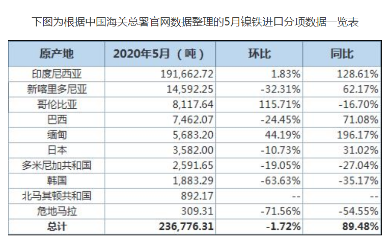 中國(guó)5月鎳鐵進(jìn)口數(shù)量環(huán)比有所回落