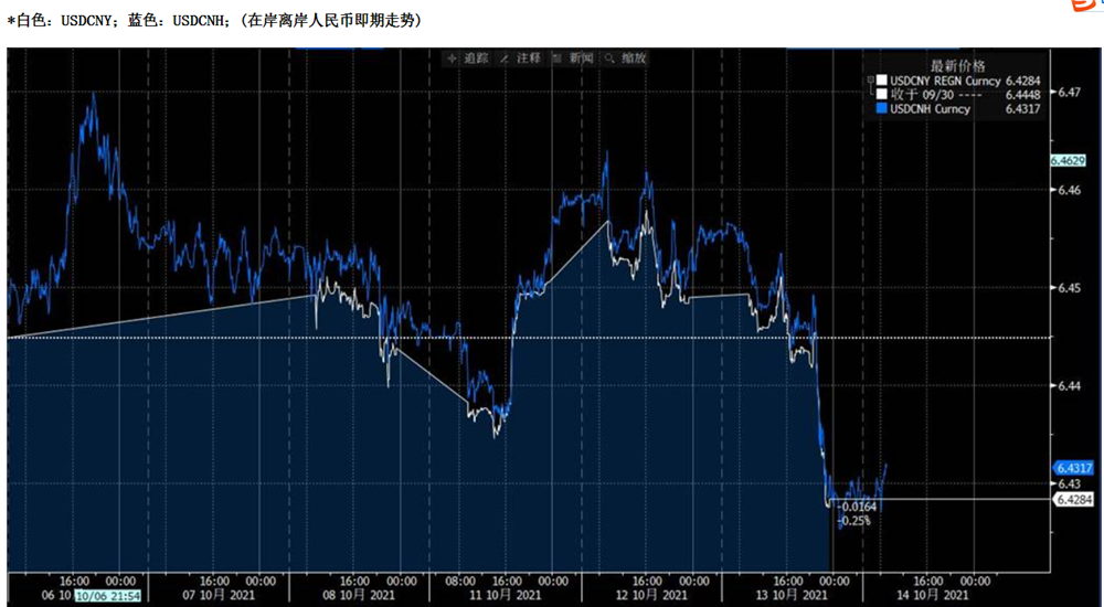 *白色:USDCNY;藍(lán)色:USDCNH;(在岸離岸人民幣即期走勢(shì))