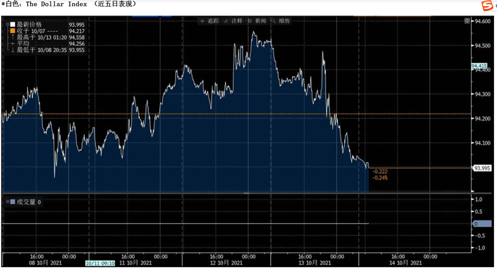 周三美元指數(shù)跌0.51%至94.04,創(chuàng)近二個(gè)月來(lái)最大跌幅,10年期美國(guó)國(guó)債收益率下跌4個(gè)基點(diǎn)至1.536%,美國(guó)30年期國(guó)債招標(biāo)結(jié)果強(qiáng)勁,推動(dòng)長(zhǎng)期國(guó)債上漲。美聯(lián)儲(chǔ)9月會(huì)議紀(jì)要顯示官員們普遍同意在11月中旬或12月中旬開(kāi)始縮減資產(chǎn)購(gòu)買(mǎi)規(guī)模。美聯(lián)儲(chǔ)9月會(huì)議紀(jì)要公布后,美元兌G-10貨幣維持跌勢(shì),在數(shù)據(jù)顯示9月份消費(fèi)者價(jià)格指數(shù)上漲超過(guò)預(yù)期之后,美元最初走高,但很快回吐了漲幅。黃金期貨價(jià)格收高2%,創(chuàng)一個(gè)多月來(lái)的最高收盤(pán)價(jià);美油小幅下跌,但仍保持在80美元關(guān)口上方,市場(chǎng)擔(dān)心原油需求增長(zhǎng)將放緩。