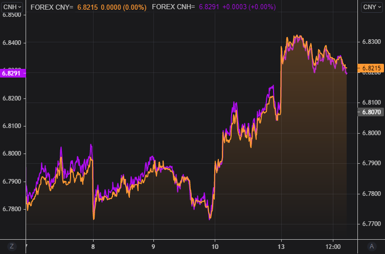 *橙色:USDCNY;紫色:USDCNH;(在岸離岸人民幣即期走勢)