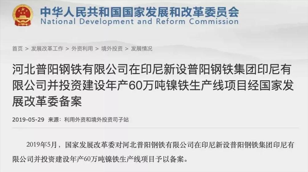 2019年5月,國家發(fā)展改革委對(duì)河北普陽鋼鐵有限公司在印尼新設(shè)普陽鋼鐵集團(tuán)印尼有限公司并投資建設(shè)年產(chǎn)60萬噸鎳鐵生產(chǎn)線項(xiàng)目予以備案。