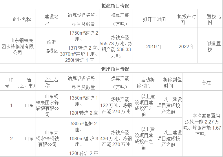 山東鋼鐵集團永鋒臨港鋼鐵項目產能置換方案公告