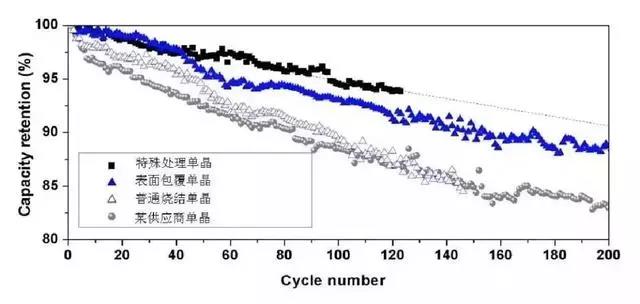 單晶材料良好的結構穩(wěn)定性使得材料具有非常好的循環(huán)穩(wěn)定性,以單晶NCM523為例,在40℃下循環(huán)300次(3-4.4V,C/2)后,單晶NCM523材料電池的容量保持率仍然可達98%,但是即便是通過Al2O3包覆處理的二次顆粒NCM523材料的容量保持率也僅有92%[5],在55℃高溫條件下,這一差距將更加明顯(單晶>94%,二次顆粒<85%)。