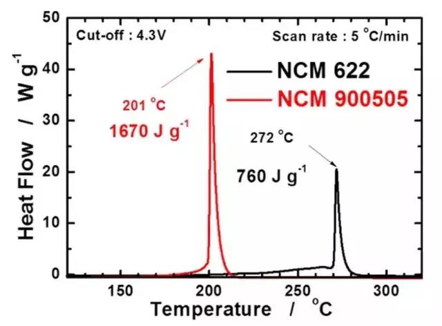 提高Ni含量也面臨同樣的問題,相比于NCM622材料,NCM900505材料的不僅循環(huán)性能大幅下降,在熱穩(wěn)定性上也出現(xiàn)了明顯的降低。在高電壓下NCM900505無論是在熱分解溫度,還是在放熱量方面也都要顯著差于NCM622材料[4],這對應了高鎳材料在電芯中較差的安全性。