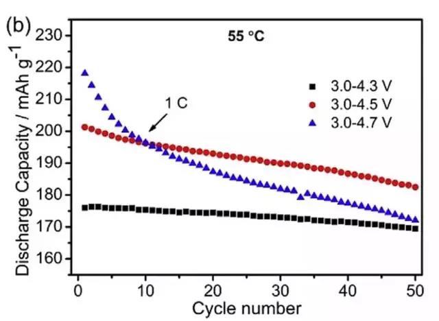 但是上述措施在提升正極材料容量的同時也會導致正極材料的循環(huán)性能和安全性能顯著的降低,以NCM622材料為例,雖然4.7V截止電壓可以為NCM622材料帶來接近220mAh/g的比容量,但是同時會導致材料的循環(huán)壽命嚴重退化。在55℃,半電池體系4.7V截止電壓下循環(huán)50次后,NCM622材料的容量保持率僅為78.9%,遠低于4.3V下循環(huán)的NCM622材料(96.3%)[3],高電壓下的高鎳材料循環(huán)穩(wěn)定性面臨嚴峻的挑戰(zhàn)。