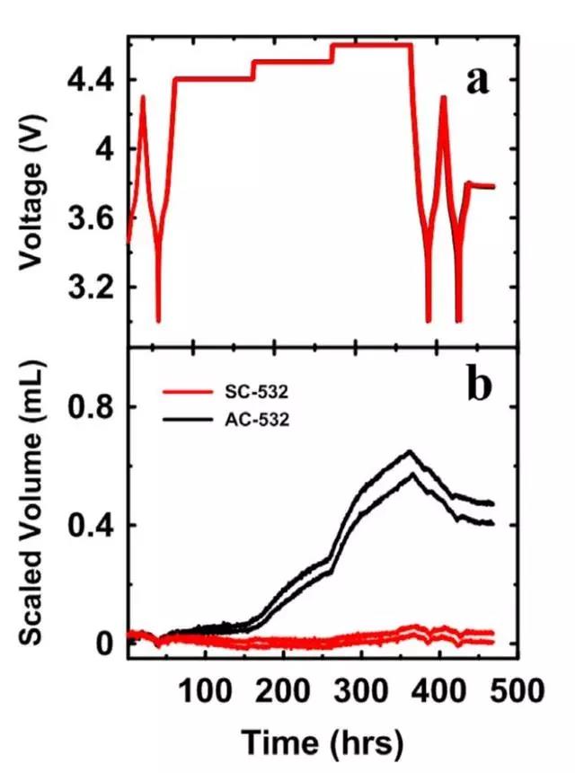近年來,隨著動力電池能量密度的持續(xù)提升,能量密度更高的軟包電池的市場份額也在逐年擴大,相比于硬殼電池,軟包電池對于材料產氣更加敏感,因此產氣量也是衡量材料穩(wěn)定性的重要指標之一。通過浮充實驗能夠發(fā)現(xiàn),單晶材料產氣量非常小[5],在4.4V、4.5V和4.6V電壓下浮充100h的產氣量僅為0.01、0.01和0.04ml,而同樣條件下Al2O3包覆的二次顆粒NCM523材料電池的產氣量則分別達到了0.07、0.27和0.62ml,這再次表明單晶材料在產氣上具有較大的優(yōu)勢。