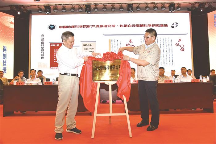 儀式上,劉振剛與陳仁義分別代表包鋼(集團)公司與中國地質(zhì)科學(xué)院礦產(chǎn)資源研究所,為白云鄂博科研基地成立揭牌。