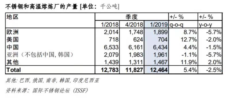 布魯塞爾2019年7月消息,國(guó)際不銹鋼論壇(ISSF)公布了2019年一季度全球不銹鋼粗鋼產(chǎn)量,具體數(shù)據(jù)顯示不銹鋼粗鋼產(chǎn)量同比下降了2.5%,至1250萬(wàn)噸。