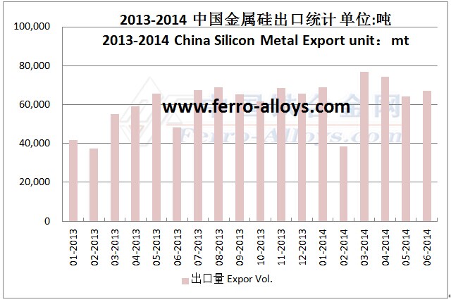 2013年,中國累計出口金屬硅數(shù)量為704280噸,同比上漲46.7%;2014年1-6月,中國累計出口金屬硅389,898噸,同比上漲27.2%。