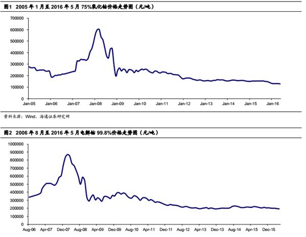 鈷當(dāng)前價(jià)格處于歷史底部,鈷價(jià)在 2008 年初受益于供需結(jié)構(gòu),飆升至 87 萬(wàn)元/噸,當(dāng)年大量的供給和金融危機(jī),導(dǎo)致到 2008 年底價(jià)格就已回落至 25 萬(wàn)元/噸,之后有一些反復(fù),但過(guò)去 7 年多時(shí)間內(nèi),一直在底部徘徊,當(dāng)前價(jià)格為 19 萬(wàn)元/噸,處于歷史大底。