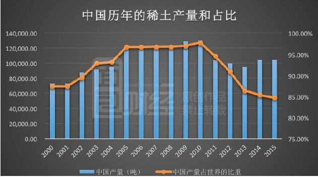 根據(jù)美國地質調查局數(shù)據(jù)計算:到2005年中國稀土產(chǎn)量已經(jīng)占到了全球產(chǎn)量的96%以上,2010年時甚至占到97%以上。