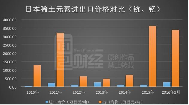 根據(jù)稀土信息網(wǎng)數(shù)據(jù)顯示,2016年前5個月日本進口稀土金屬、釔和鈧及其無機和有機化合物累計621.1噸,金額17.74億日元,約為285.55萬日元/噸,每噸進口價折合美元約為2.65萬美元。而經(jīng)過深加工后,制成品出口均價約3390萬日元/噸,折合美元為31.41萬美元/噸。售價是進口價的11.85倍。