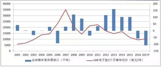 圖2:2001年以來LME鎳年度均價與供需缺口對比圖(單位:萬噸)