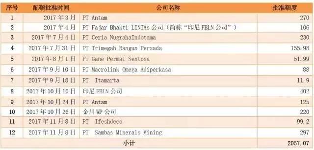 表1:2017年以來印尼新增鎳礦出口配額匯總表(單位:萬噸)