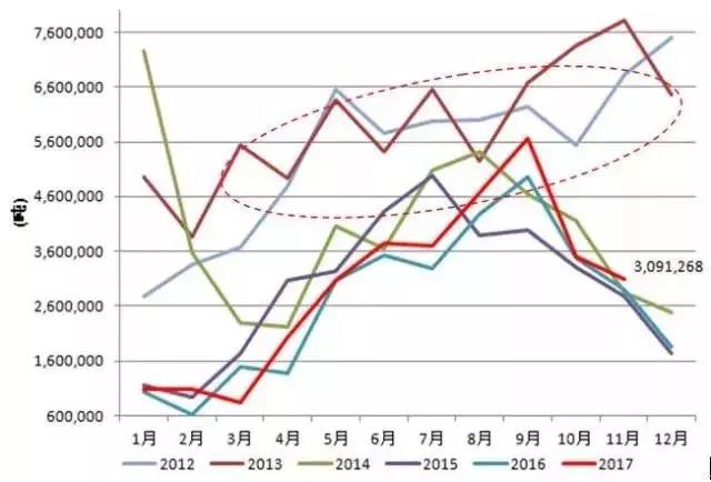 圖3:2012年以來中國鎳礦進口季節(jié)性圖表(單位:噸)