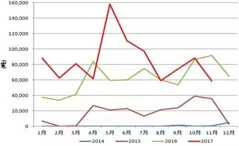 圖4:2014年以來中國從印尼進口的鎳鐵季節(jié)性圖表(單位:噸)