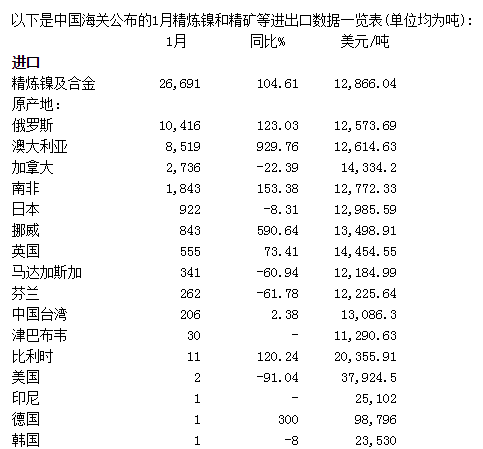數據亦顯示,中國1月精煉鎳及合金進口量為26,691噸,同比增幅為104.61%。