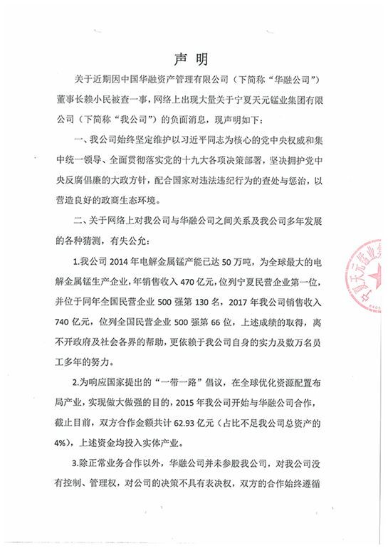 關(guān)于近期因中國華融資產(chǎn)管理有限公司(下簡稱“華融公司”)董事長賴小民被查一事,網(wǎng)絡(luò)上出現(xiàn)大量關(guān)于寧夏天元錳業(yè)集團(tuán)有限公司(下簡稱“我公司”)的負(fù)面消息,現(xiàn)聲明如下: