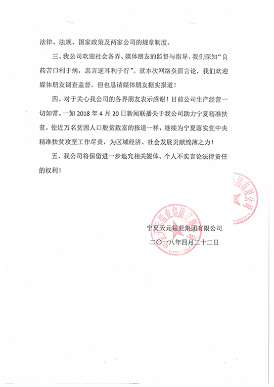 四、對于關(guān)心我公司的各界朋友表示感謝!目前公司生產(chǎn)經(jīng)營一切如常。一如2018年4月20日新聞聯(lián)播關(guān)于我公司助力寧夏精準(zhǔn)扶貧,使近萬名貧困人口脫貧致富的報道一樣,繼續(xù)為寧夏落實黨中央精準(zhǔn)扶貧攻堅工作盡責(zé),為區(qū)域經(jīng)濟(jì)、社會發(fā)展貢獻(xiàn)綿薄之力!