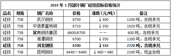 另,云南某鋼廠12月硅鐵75B招標(biāo)價(jià)格敲定為6440—6460元/噸(現(xiàn)金含稅),較上一月價(jià)格下跌460—480元/噸,采購(gòu)數(shù)量2100噸,環(huán)比增量1100噸。2019年1月份部分鋼廠硅鐵招標(biāo)匯總?cè)缦拢?/span>