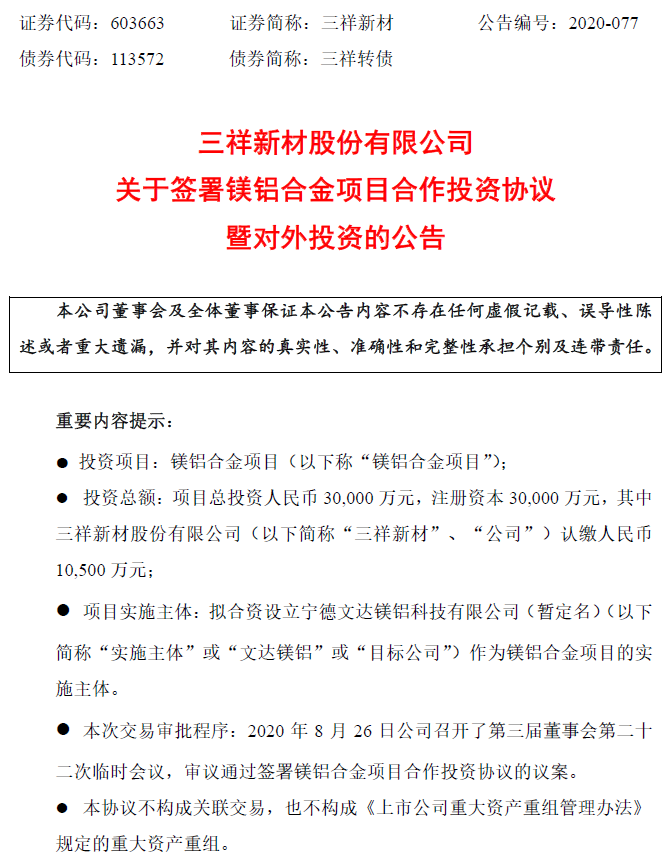 為了推進(jìn)公司在新材料行業(yè)的戰(zhàn)略發(fā)展規(guī)劃和布署,不斷豐富公司產(chǎn)業(yè)鏈,公司擬與寧德時(shí)代新能源科技股份有限公司(以下簡(jiǎn)稱“寧德時(shí)代”)、江蘇萬(wàn)順機(jī)電集團(tuán)有限公司(以下簡(jiǎn)稱“萬(wàn)順集團(tuán)”)、中山市雋達(dá)股權(quán)投資管理企業(yè)(有限責(zé)任合伙)(以下簡(jiǎn)稱“雋達(dá)投資”)、中山銀泰股權(quán)投資管理企業(yè)(有限合伙)(以下簡(jiǎn)稱“銀泰投資”)共同投資鎂鋁合金項(xiàng)目。本次鎂鋁合金項(xiàng)目的實(shí)施主體暫定名為寧德文達(dá)鎂鋁科技有限公司,注冊(cè)資本為30,000萬(wàn)元,寧德時(shí)代、萬(wàn)順集團(tuán)、三祥新材、雋達(dá)投資、銀泰投資按25%:17%:35%:9%:14%的比例共同投資鎂鋁合金項(xiàng)目。