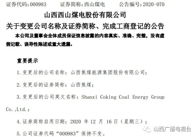 11月20日晚間,焦煤集團旗下A股上市公司對外發(fā)布公告稱,擬將公司名稱由“山西西山煤電股份有限公司”變更為“山西焦煤能源集團股份有限公司”,證券簡稱擬變更為“山西焦煤”,此舉意味著與A股相伴20年的“西山煤電”將成為過去時。