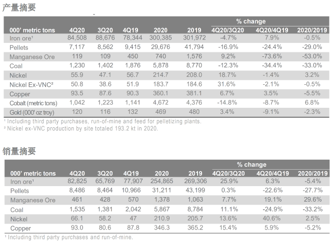 淡水河谷發(fā)布2020年產(chǎn)銷量報(bào)告,報(bào)告表示2020年,淡水河谷鐵礦石粉礦產(chǎn)量累計(jì)為3.004億噸,與2019年持平,原因包括:(1)大瓦爾任(Vargem Grande)和廷博佩巴(Timbopeba)等礦區(qū)恢復(fù)了此前暫停的運(yùn)營(yíng);(2)S11D礦區(qū)達(dá)產(chǎn);(3)阿萊格里亞(Alegria)礦區(qū)實(shí)現(xiàn)全年運(yùn)營(yíng)。