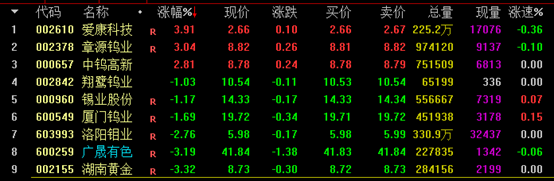 今日,鎢上市公司開(kāi)盤(pán)表現(xiàn)漲跌不一,下午收盤(pán)愛(ài)康科技漲幅近4%,章源鎢業(yè)漲超3%。中鎢高新漲超2%,湖南黃金跌超近3.5%,廣晟有色跌超3%,洛陽(yáng)鉬業(yè)跌近3%。