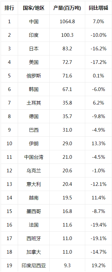 2021世界各國鋼產(chǎn)量排行榜