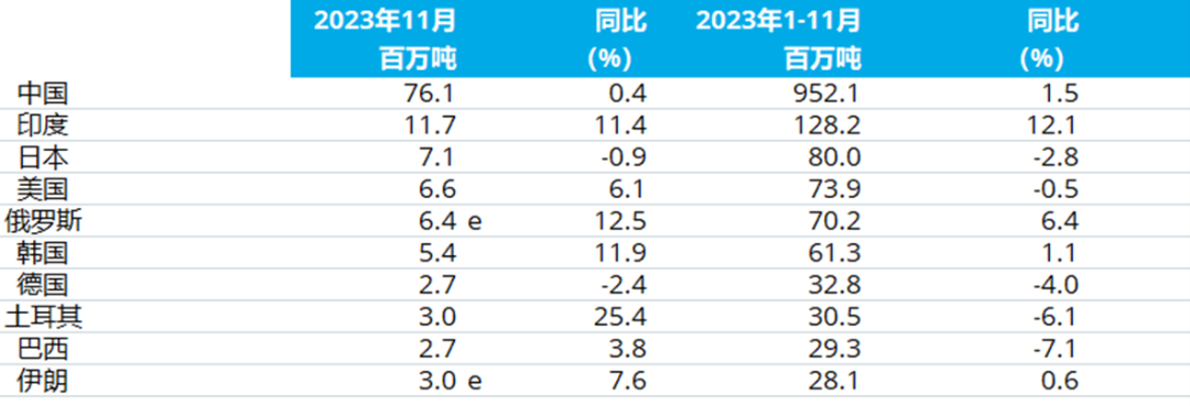 e - 預(yù)估值。排名依據(jù)為本年度累計(jì)粗鋼產(chǎn)量。
