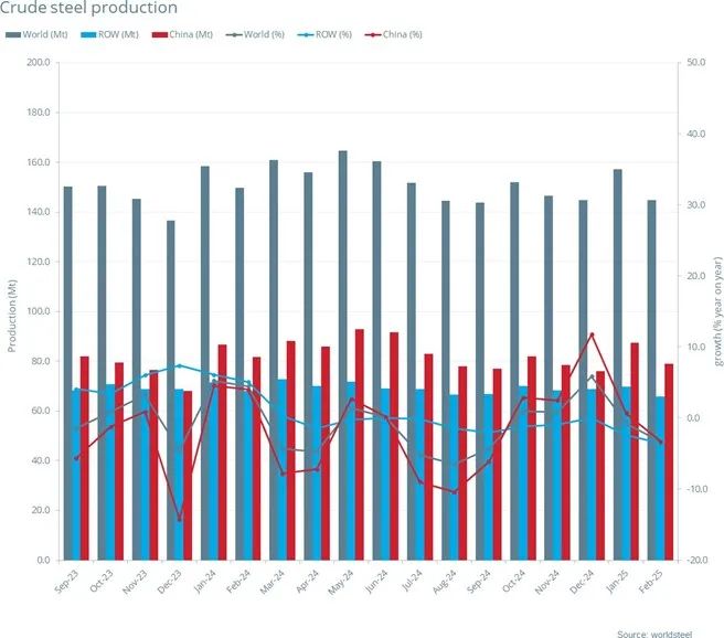 2025年2月全球粗鋼產(chǎn)量同比下降3.4%
