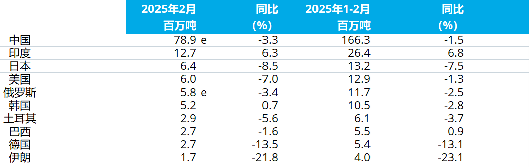 粗鋼產(chǎn)量排名前十位的國家2025年2月,中國粗鋼預估產(chǎn)量為7892萬噸,同比下降3.3%;