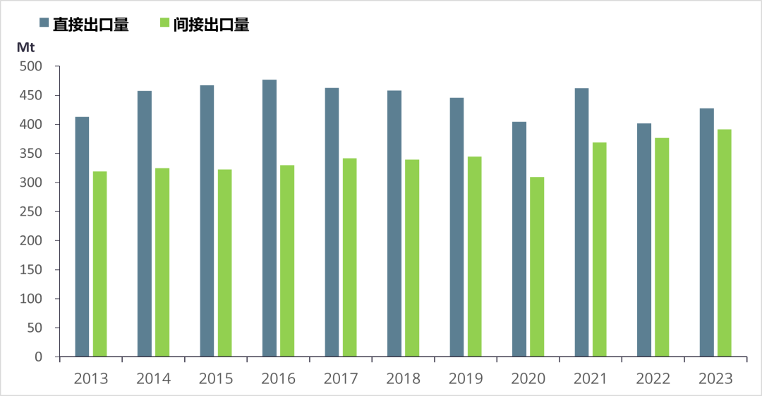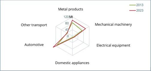 2013年至2023年期間,納入分析的74個(gè)國(guó)家/地區(qū)的鋼鐵間接出口量從3.19億噸增長(zhǎng)至3.92億噸,增幅為23%。2023年,鋼鐵間接貿(mào)易量相當(dāng)于直接出口量的95%。