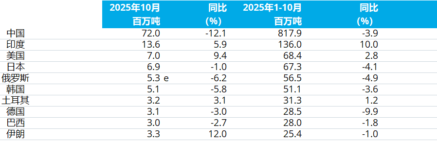 粗鋼產(chǎn)量排名前十位的國家2025年10月,中國粗鋼產(chǎn)量為7200萬噸,同比下降12.1%;