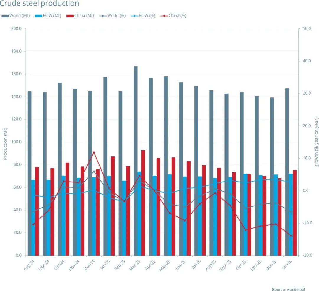 2026年1月, 中國粗鋼預(yù)估產(chǎn)量為7527萬噸,同比下降13.9%;