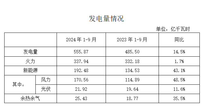 2024年1-9月份全市電力企業(yè)累計(jì)發(fā)電555.87億千瓦時(shí),較上年同期新增70.4億千瓦時(shí)