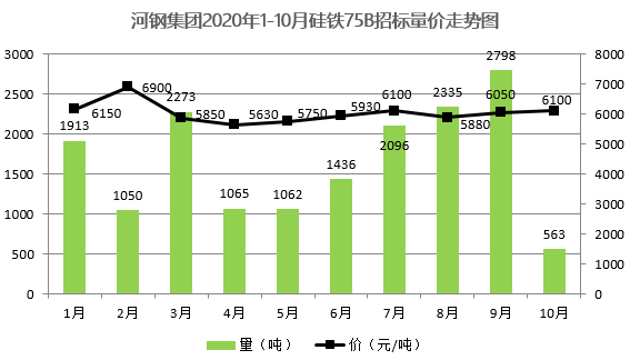 河鋼集團(tuán)2020年1-10月硅鐵75B招標(biāo)量?jī)r(jià)走勢(shì)圖。
