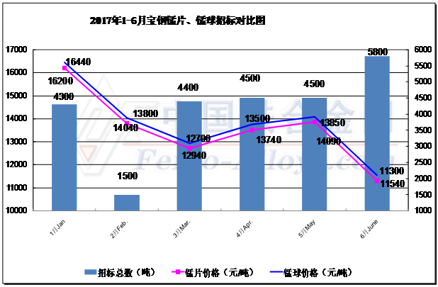 2017年上半年,國內(nèi)主要鋼廠寶鋼錳片、錳球招標(biāo)價格呈“下跌-上漲-下跌”趨勢。 |