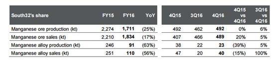 錳礦:South 32公司2016年第二季度錳礦總產量環(huán)比減少2.1%